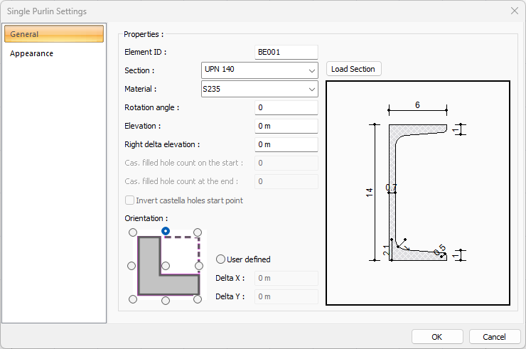 With the Single Purlin Settings command, settings such as section, angle, elevation, placement, material, drawing can be accessed.