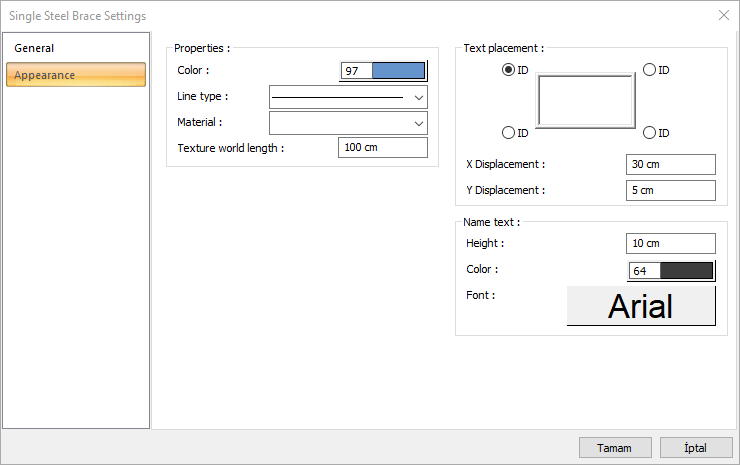 Name text ![]() The height of the brace name text is entered. The color box is slid over the color palette that is opened by clicking and holding down the button with the left mouse button. The button is released when the intended color is reached. The color box turns into the selected color. If clicked together with the Shift key, the pen thickness of the relevant color can be adjusted. If the button below is clicked, the Font Settings dialog opens. Brace Name Text, font type is set from this dialog. |