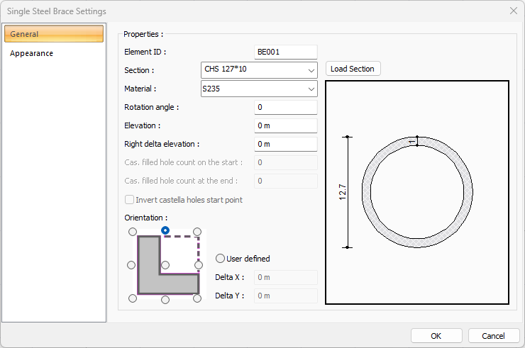 Material ![]() The material for the single steel brace is selected. |