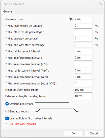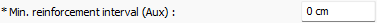 Min. reinforcement interval (Aux) ![]() It is the parameter that limits the minimum distance between additional rebars in slabs. This parameter is taken into account when selecting additional rebars in slabs. If the distance between two additional rebars is less than the minimum rebar spacing, the rebar diameter is increased. In parameters marked with ( * ), the text 0 “zero” means that the value specified in the design code is used. |
