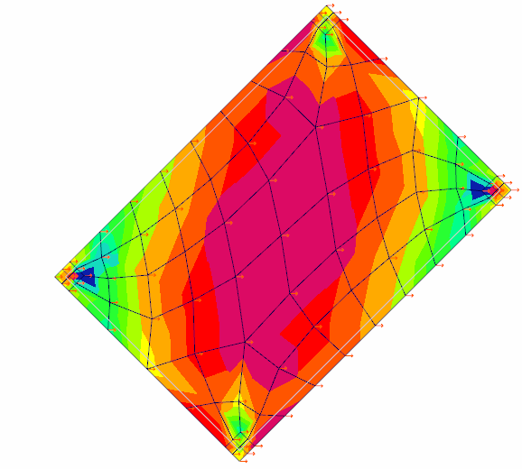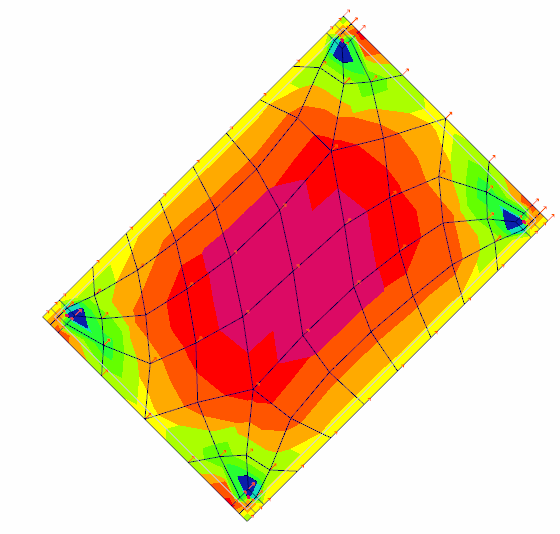 Moment calculation angle ![]() When this value is left zero, the slab axes are taken as 0 degrees in the 1st direction and 90 degrees in the 2nd direction during the slab analysis. In a rotated structure, the moment calculation angle is also refreshed automatically. The value can be changed when slab analysis is desired to be performed according to the axis at different angles. 1. The structure is defined parallel to the x axis. When the torque angle is 0 degrees, the following moment diagram is obtained. ![]() 2. If the structure is rotated 45 degrees and the moment angle is given 45 degrees, the same results as 1 are obtained. ![]() 3. If the moment angle is left zero in a structure that is entered as 45 degrees, results different from 1 and 2 will be obtained. ![]() |