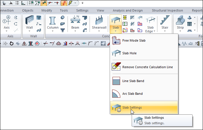 With the Slab Settings command, settings such as concrete slab size, elevation, material selection, structural material, rib and waffle slab tooth dimensions are accessed.