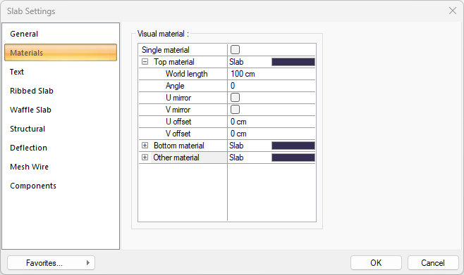 Single material ![]() By selecting the single material option, the material selected in "Top material" is used on all surfaces of the slab. |
