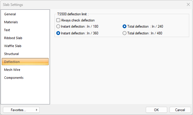 TS500 Deflection limits: Give deflection control upper limits. Values taken from TS500. If the "Always check deflection condition" option is selected, the instantaneous and temporal deflection control is performed on the slabs even if the "deflection condition is a height condition that does not require deflection control" is checked.