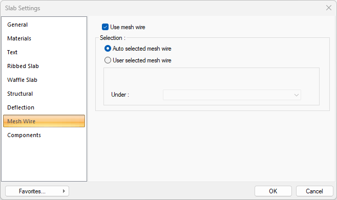 Use selected mesh wire ![]() Regardless of the analysis result, if you want the program to use the reinforcement you have provided as mesh wire, check this option. Next, select mesh wire from the list to use under. |