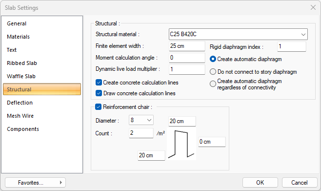 Reinforcement chair ![]() By selecting the option, the reinforcement chair is defined for the slab. |