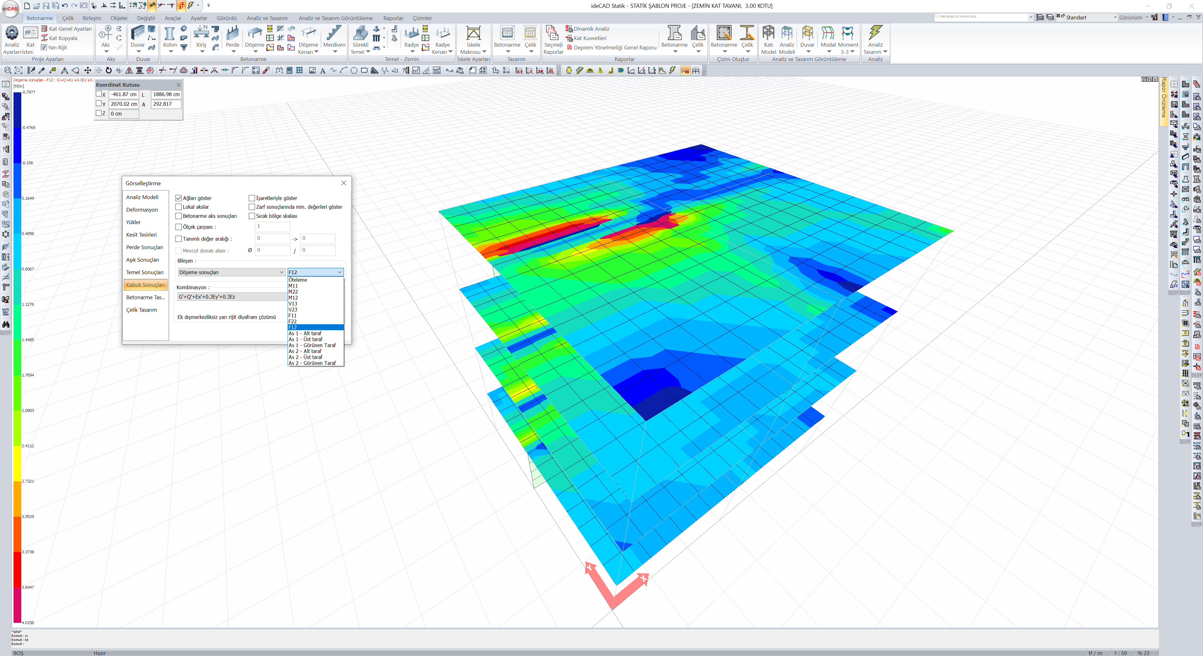 With the semi-rigid diaphragm solution, the in-plane tensile stresses in floors are obtained from the F11 and F22 results calculated under the combined effect of the earthquake loads calculated by taking into account the vertical loads multiplied by the load coefficients and the Strength Excess Coefficient D.