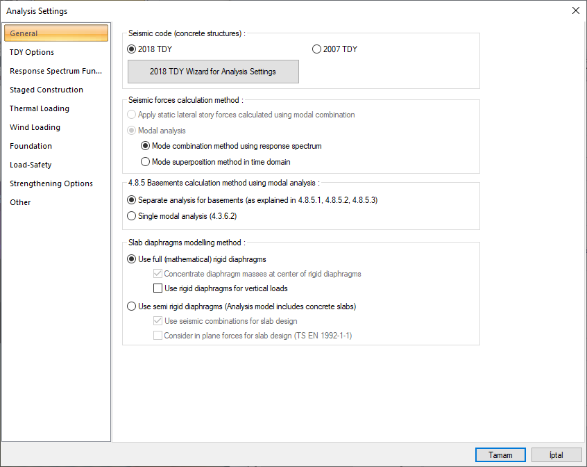 In the TBDY 2018 Analysis Settings Wizard, regulations are checked and other options are automatically turned off when a semi-rigid diaphragm is required .