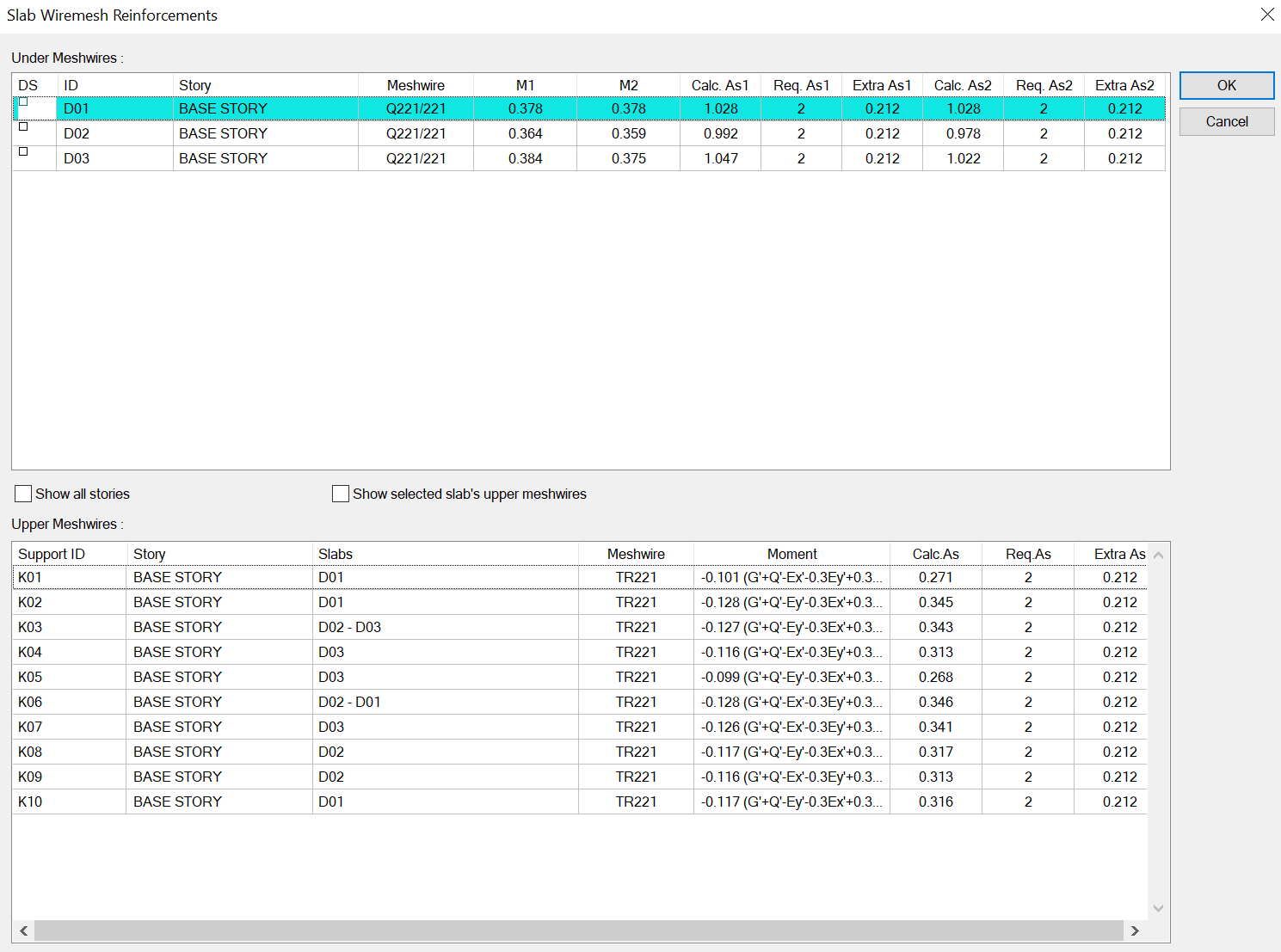 Analysis, design and code requirements check results of mesh-reinforced slabs are given in the Slabs With Mesh Wire dialog. Detail results of floors designed as mesh reinforcement are given in this dialog.
