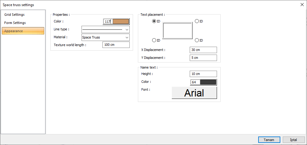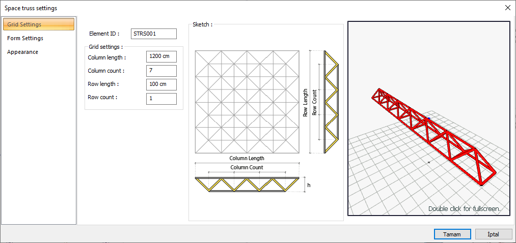 With the Space Truss Settings command, settings such as grid settings, vertex location and height, section selection, drawing are accessed.