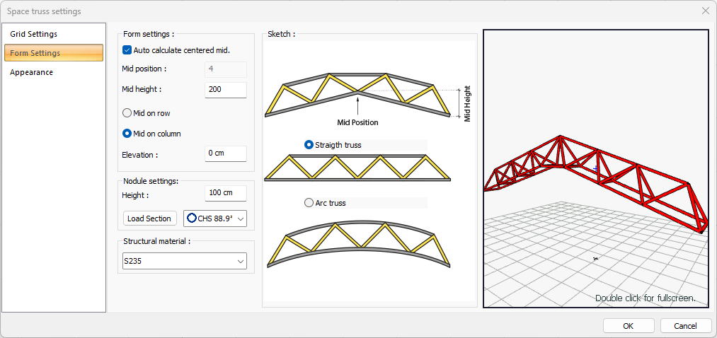 Sketch ![]() It includes options whether the space truss will be arc or straight. |