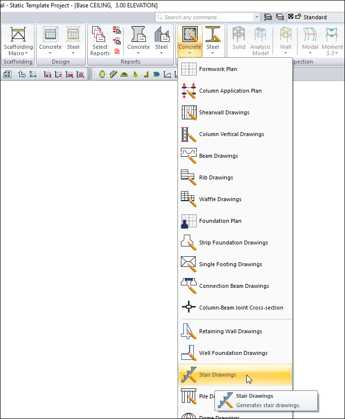 Drawings of the stairs, whose calculation axes have been defined and analyzed, can be prepared with the Stair Drawings command.