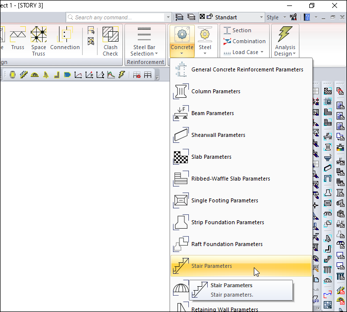 With the Stair Parameters command, the design parameters used in the Concrete Stair Design are determined. Concrete cover, maximum and minimum reinforcement interval, minimum tension percentage for main and other direction, etc. parameters are determined from the stair parameters window.