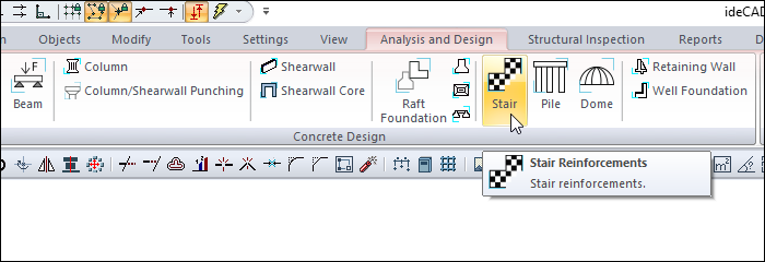 After the analysis, you can access it by clicking the Stair Reinforcement command under the Concrete Design title of the ribbon menu Analysis and Design tab .