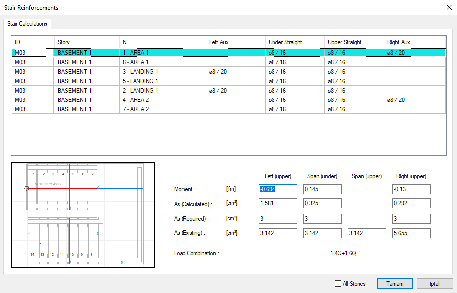 Concrete design results of stairs and inadequacies regarding stairs are displayed in the Stair Reinforcements dialog. Straight and additional reinforcement results are given in the Stair Reinforcements dialog.