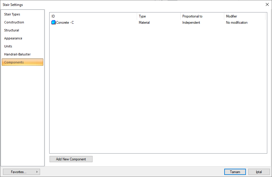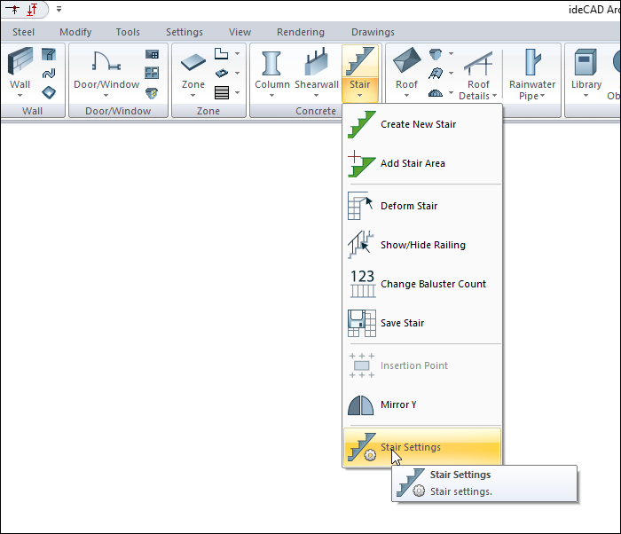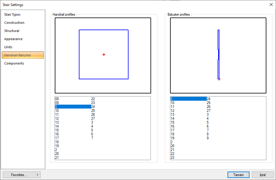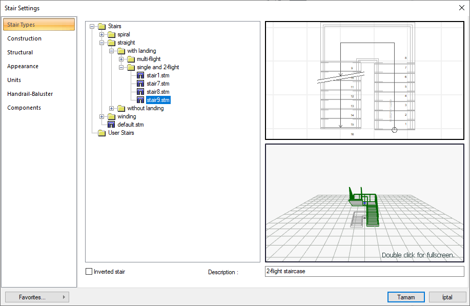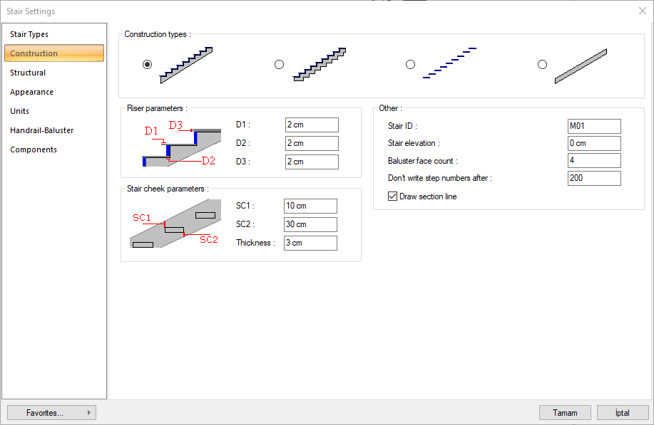 Stair settings are included in the Stair Settings dialog, which includes parameters such as stair type, construction type, material, railing and handrail types . Before the stair is created, the stair settings dialog opens, and the settings made will be valid for the stairs to be drawn from now on.