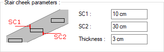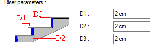 Riser parameters ![]() D1 is the step cladding nose length, D2 is the riser cladding thickness, D3 is the step cladding thickness. If cladding is not wanted, these values are entered as zero. |