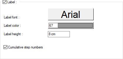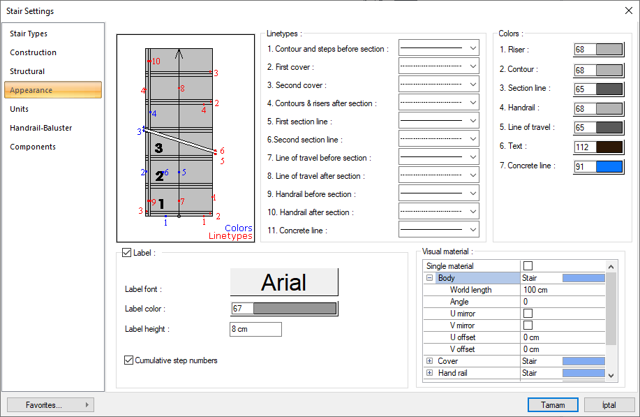 Label ![]() By marking the label, the number of risers, riser height and step width are shown on the stair. The font of the label font and the number of risers, the height and width of the digit is selected. The text color of the label color and the number of risers, the height and width of the digit is selected. The number of risers, the height of the digit and the height of the text of the width text are entered on the label height. The total number of digits is unmarked, and the number of risers, riser height and step width are shown separately on each branch. If checked, total values are shown. |
