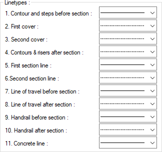 Linetypes ![]() A separate line type is selected for the lines forming the stair in the plan. Clicking the down arrow buttons to the right of the boxes opens the list of line types. From this list, the wanted line type is selected by clicking with the left mouse button. The lines are numbered in red on the figure on the left. |