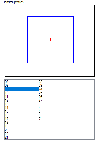Handrail profiles ![]() Select a handrail from the list of handrails by clicking with the left mouse button. The selected handrail section is displayed on the handrail screen. | |