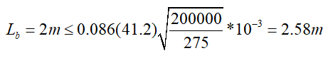 The longest unsupported beam segment in the lateral direction is Lb = 2.0 m. According to TBDY 2018 9.2.8.1(a), the distance between the points where the lower and upper ends of special beams are supported, Lb should meet the following condition.