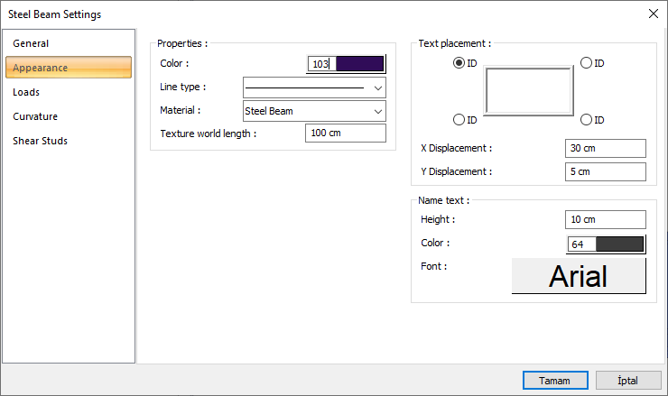 Name text ![]() The height of the beam name text is entered. The color box is slid over the color palette that is opened by clicking and holding down the button with the left mouse button. The button is released when the desired color is reached. The color box turns into the selected color. If clicked together with the Shift key, the pen thickness of the relevant color can be adjusted. If the button below is clicked, the Font Settings dialog opens. Beam Name Text, font type is set from this dialog. |