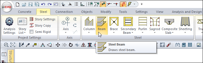 With the Steel Beam Settings command, settings such as section, angle, elevation, layout, load selection, material, drawing are accessed.