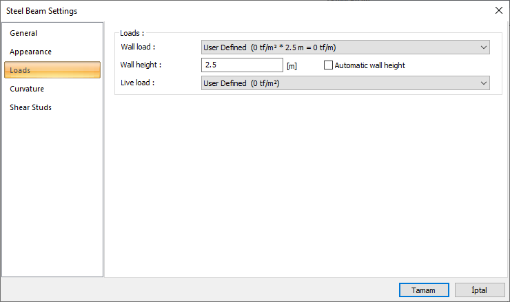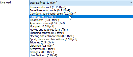 Live load ![]() It is the extra additional live load that can be defined on the beam. It can be used if extra load is defined outside the system to the beam. The appropriate value is selected from the list. The loads in the list are those defined in the load library. If you want to specify a value other than these values as load, the user defined line is selected from the list and the appropriate value is given. |