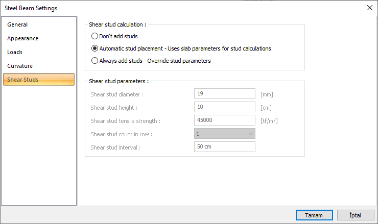 Shear stud parameters ![]() It becomes active if the always add shear stud option is selected, and it is used to determine parameters such as diameter, height, spacing, tensile strength. |
