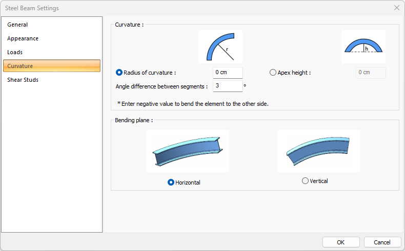 Radius of curvature ![]() The radius value is given according to the center of the arc segment based on the height of the column. Negative value will create curvature to the other side. |