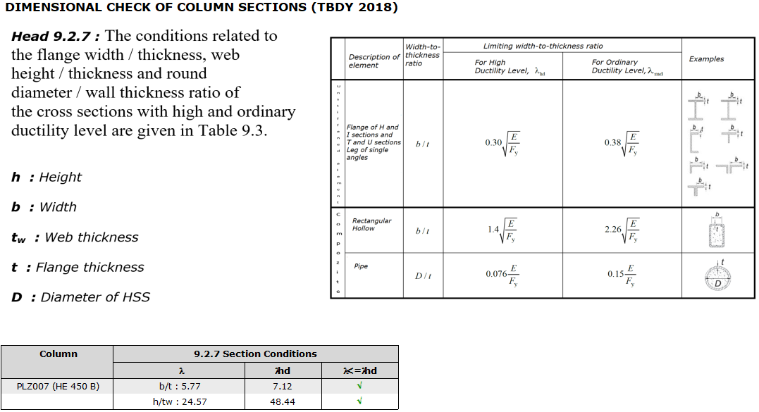 It should be checked whether the flange width/thickness and web height/thickness values of the column cross-section exceed λhd value given in Table 9.3 .