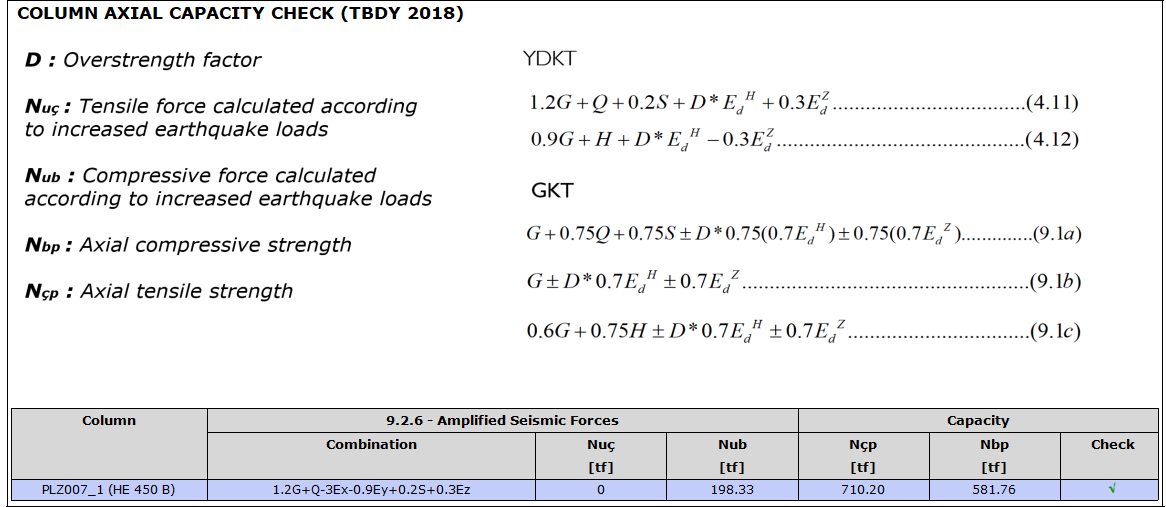 In addition to the axial capacity we design the elements under combined effects above, the axial tensile force must also be controlled in accordance with TBDY 9.3.1.3. The point to be considered in this check is that the horizontal earthquake effects obtained from the analysis must be increased by D, overstrenght factor.