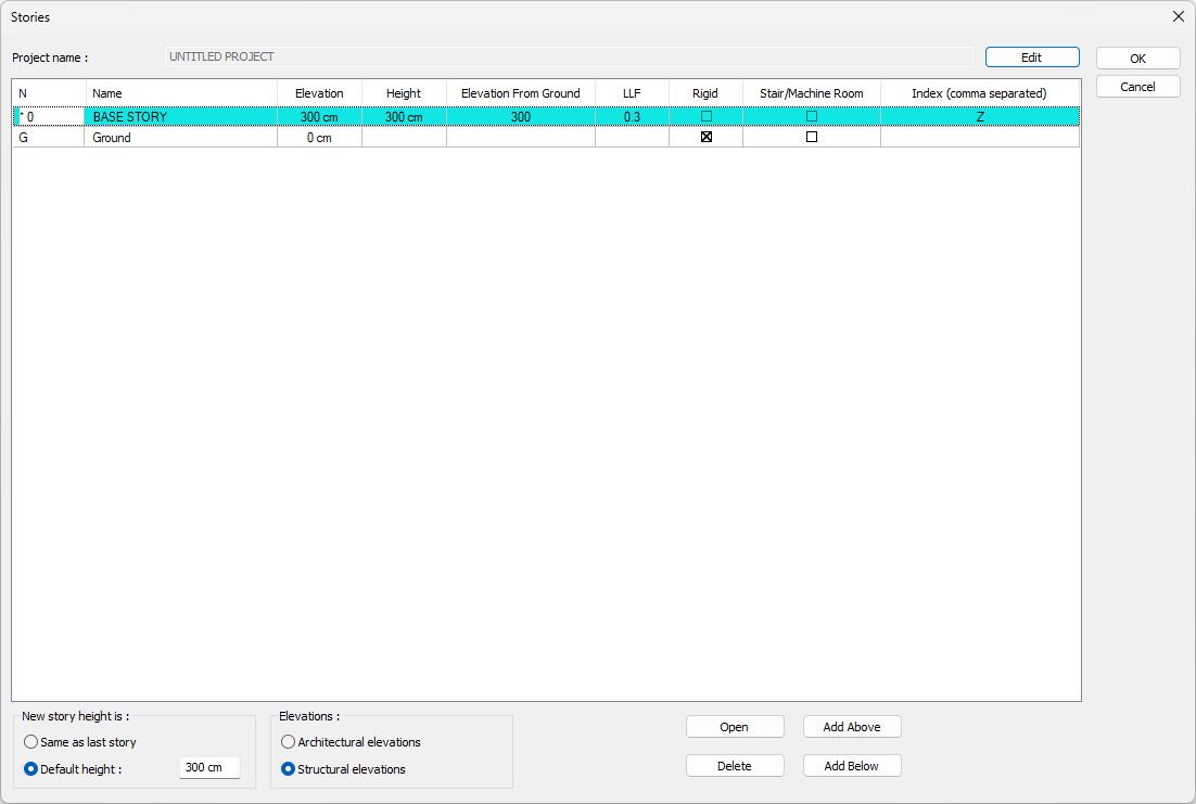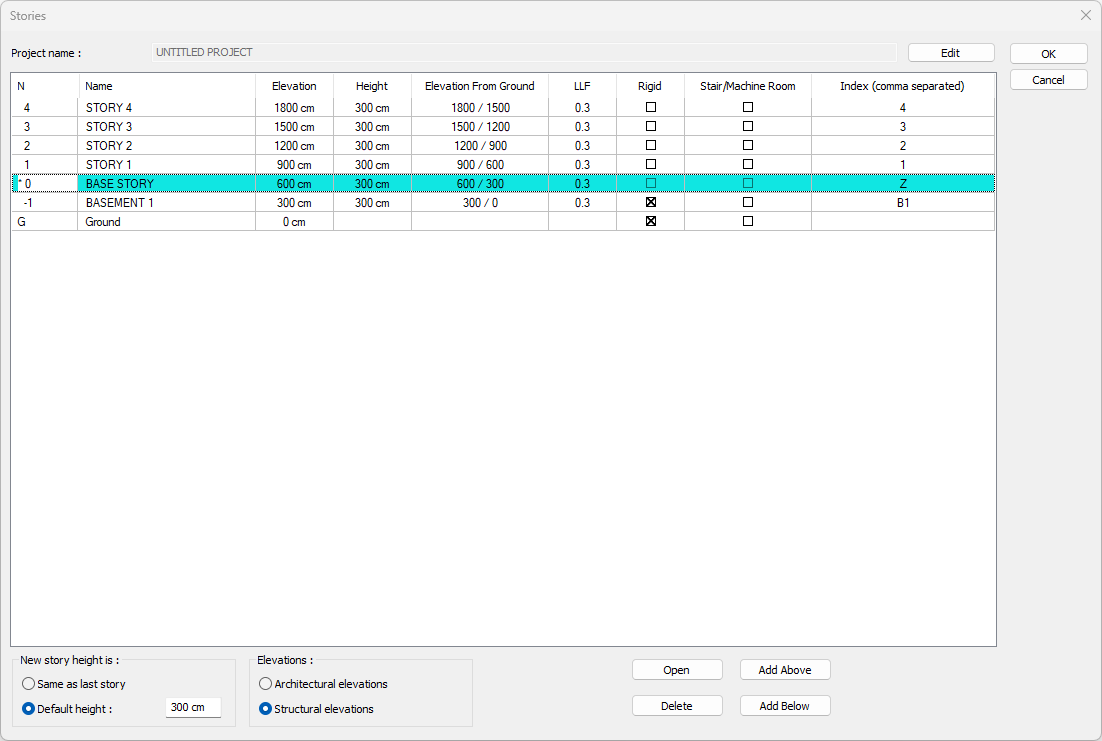 Story information is located in separate windows. There are as many story windows in a project. When a new project is opened with the default template, the base story window appears on the screen. The name of this story is Base, its base level is zero, its height is 300 cm, its live load participation coefficient (LLF) is 0.3, it is not rigid floor and its index is Z letter.