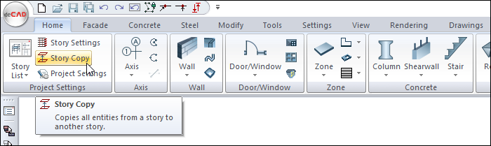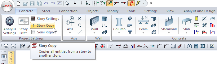 The Story copy command copies objects from one story to another story or stories. In architectural or structural project design, all objects on the story can be copied, as well as only selected objects.