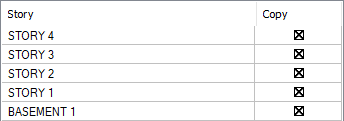 The list in the dialog consists of the Story and Copy columns. In the story column, there are stories other than the active story in the project, and there are boxes for each of them in the copy column.
