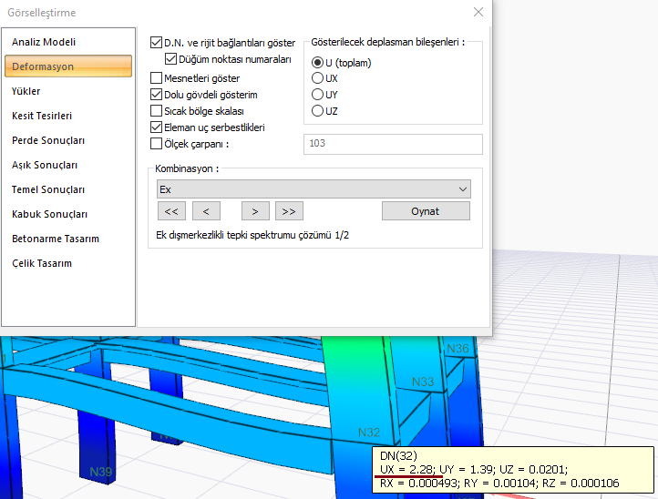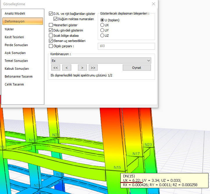 First of all, it is necessary to determine the column with the highest horizontal displacement in EX loading at each floor. For this, perspective screen - view analysis model - deformations - EX loading is selected. The X direction displacement of the top joint of the columns at each level is read.