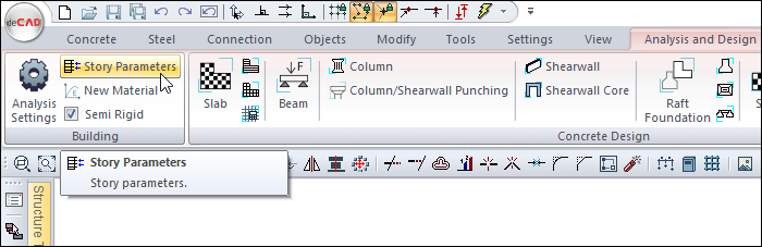 Story parameters can be opened by clicking on the Story Parameters icon under the Building heading in the Analysis and Design menu of the ribbon Menu.