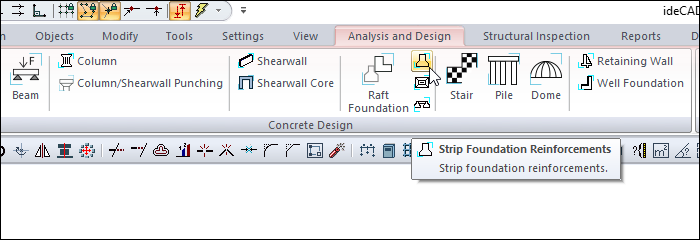 After the analysis, you can access it by clicking the Strip Foundation Reinforcements command under the Concrete Design title of the ribbon menu Analysis and Design tab .