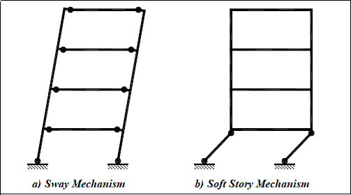 The sway mechanism is preferred in Figure (a), while in Figure (b), the soft story mechanism is not desired. As shown in Figure (b), when the hinges are formed at the ends of the columns, this situation leads to brittle collapse.