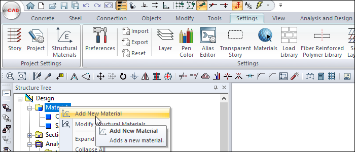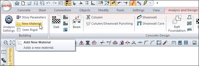 Concrete and reinforcement, and steel classes can be defined with the New Material or Add New Material command.