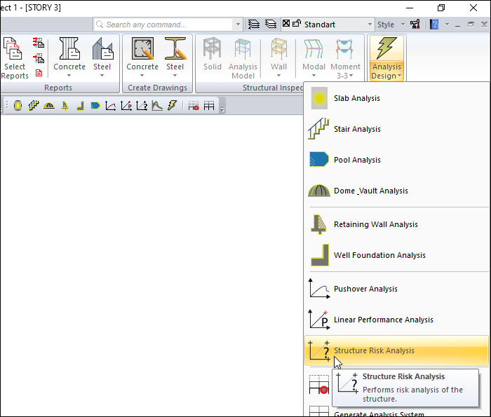 You can access the Structure Risk Analysis command under the Analysis heading of the ribbon menu Analysis and Design tab.
