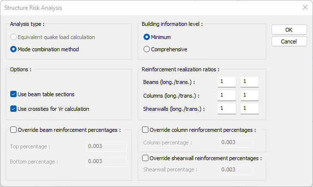 Analysis type ![]() In the risky building analysis, it is selected whether the earthquake load will be determined according to the equivalent earthquake load method or according to the mode combination method. The equivalent seismic load method can be applied in buildings with a total height above the basement not exceeding 25 meters and a total number of eight floors, and with n bi <=1.4 without considering additional eccentricity. For other cases, the Mod combination method should be applied. |