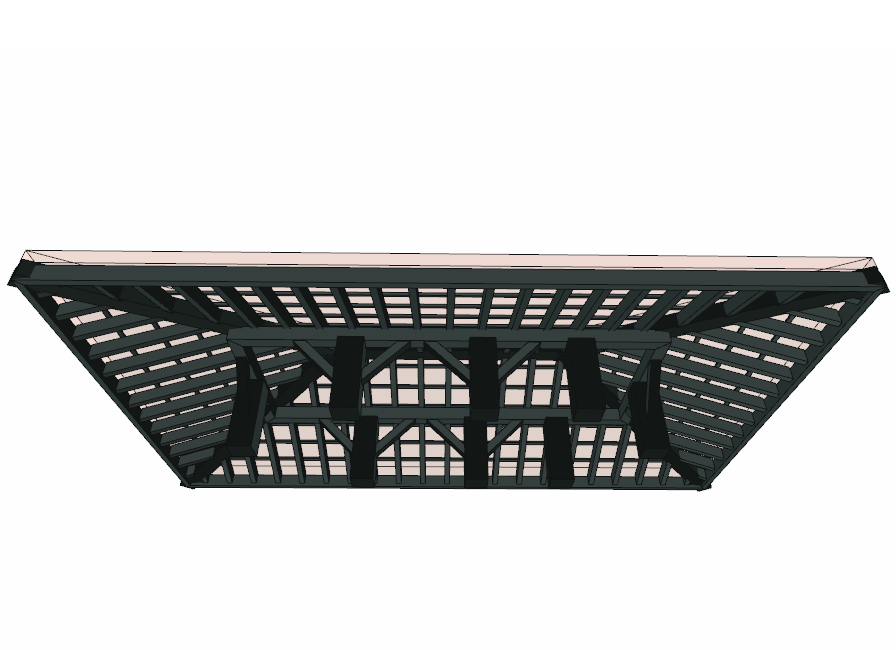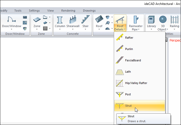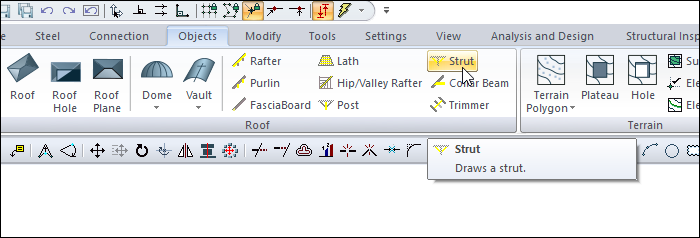 Struts are cross roof elements drawn between post and purlin or hip/valley rafter. In order to draw a strut, purlin / hip/valley rafter and post must be drawn first. With the strut command, the strut roof detail is created.