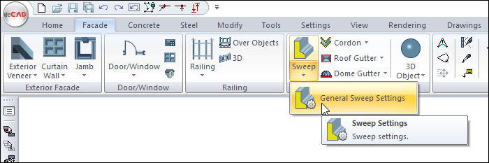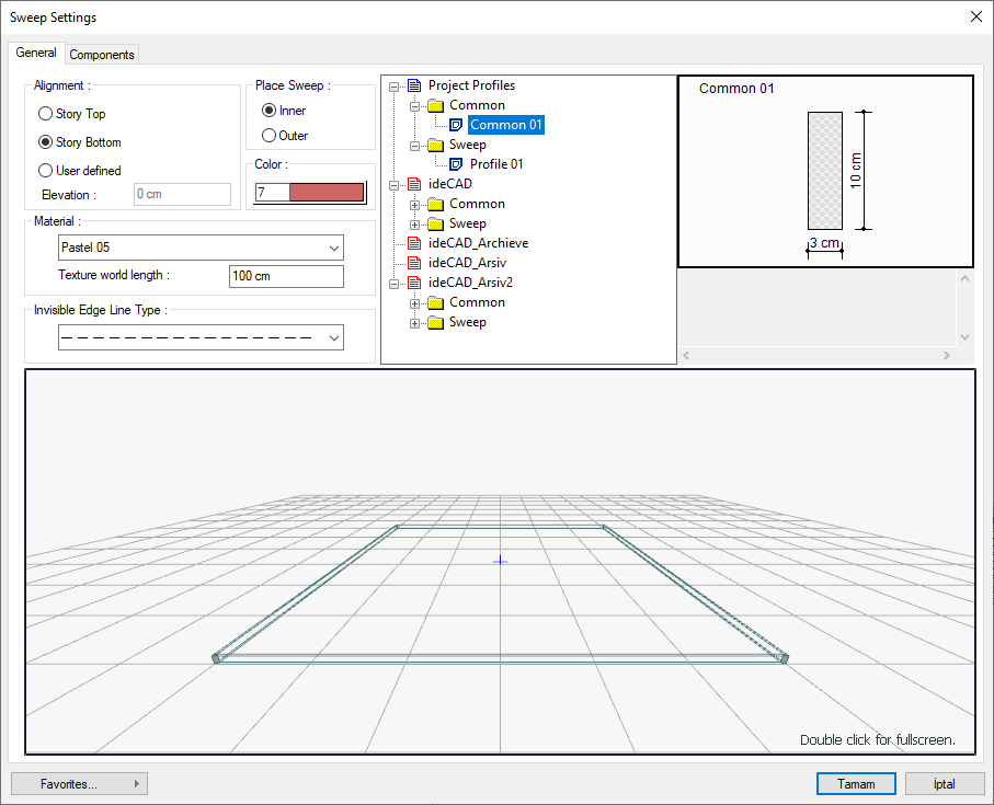 With the General Sweep Settings command, the alignment type, elevation, material and drawing settings of the profile object can be accessed.