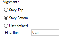 Alignment ![]() The position of the sweep in the story is adjusted. If "story top" is checked, the profile object is placed on the ceiling of the story, if "story bottom" is marked, the profile object is placed on the floor of the story. If "User defined" is marked and the elevation is given, the sweep is drawn according to the floor of the story entered as high as the entered elevation. |