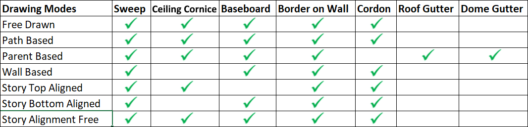 Different drawing modes can be used when drawing sweeps. There are 4 different drawing modes in the program: Free Drawn, Path Based, Parent Based , Wall Based . These are in addition to story top aligned, story bottom aligned and story alignment free drawing mode with alignment options are available.