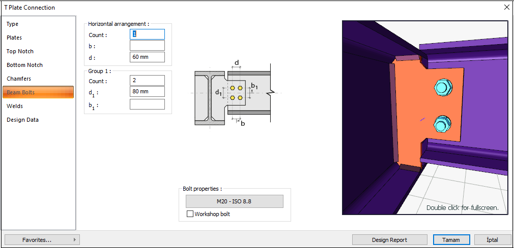 T-plate connection limit states and geometry checks are done automatically according to AISC 360-16.