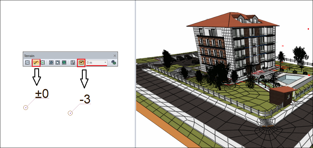 With the "Elevation point" command, an elevation point is create at the clicked point on the terrain by entering an elevation value in the elevation box on the terrain toolbar.