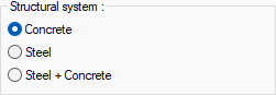Structural system ![]() If the building block consists of only concrete elements, Concrete, if it consists of only steel elements, Steel + Concrete option is selected if it consists of concrete and steel elements. It is one of the parameters selected in 2018 TDY wizard for analysis settings, and this row is automatically refreshed when the wizard is used. |