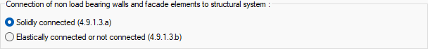Connection of non load bearing walls and facade elements to ![]() 1st option is marked, if hollow or non-void infill walls and facade elements made of brittle material are completely adjacent to the frame members without any flexible joints or connections between them, If flexible joints are made between infill walls made of brittle material and frame elements, the facade elements are connected to the outer frames with flexible connections, or the infill wall element is independent from the frame, option 2 is marked. Relative story displacements are made according to the limit determined according to the given option. |